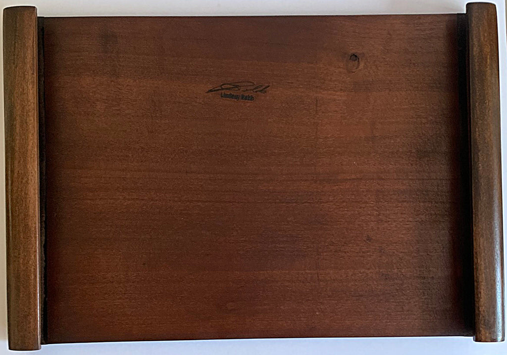 This stand is made from Tasmanian Myrtle and measures 38.4 x 25.7 x 3.6 cm. Lightly stained and finished with satin varnish.