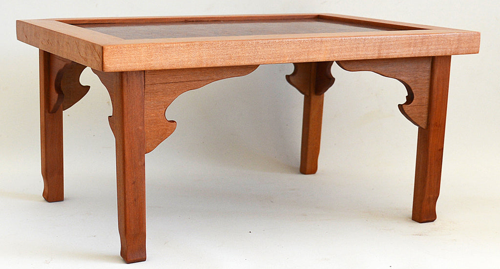 This stand is made from Tasmanian Myrtle left natural, with a hard oil finish, and with a top insert of Black Box burl wood.. The stand measures 33.4 x 23.8 cm at the top and is 16.8 cm high. The inside frame measurement on top is 27.5 x 17.8 cm. This is a great piece of burl wood in the panel with very nice quilting and shimmer. This stand has an underside support strut to allow the stand to hold a heavy item.